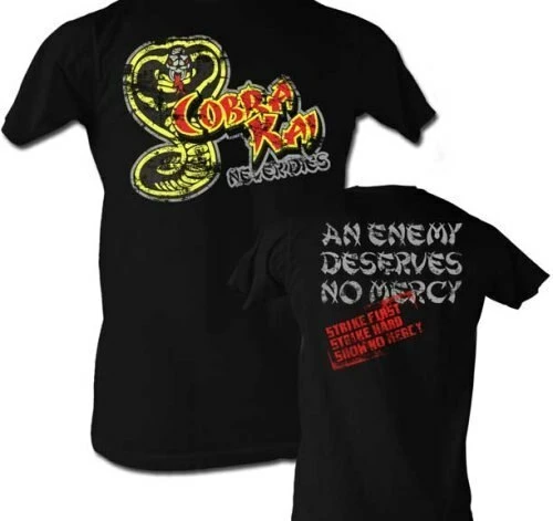 A Cobra Kai never dies! Show no mercy by wearing this officially licensed “Karate Kid” t-shirt featuring the dojo’s logo alongside the lengend, “Cobra Kai never dies,” on the front. The back of the shirt says, “An enemy deserves no mercy: strike fast, strike hard, show no mercy.” Thank you, sensei!