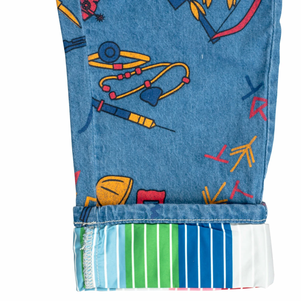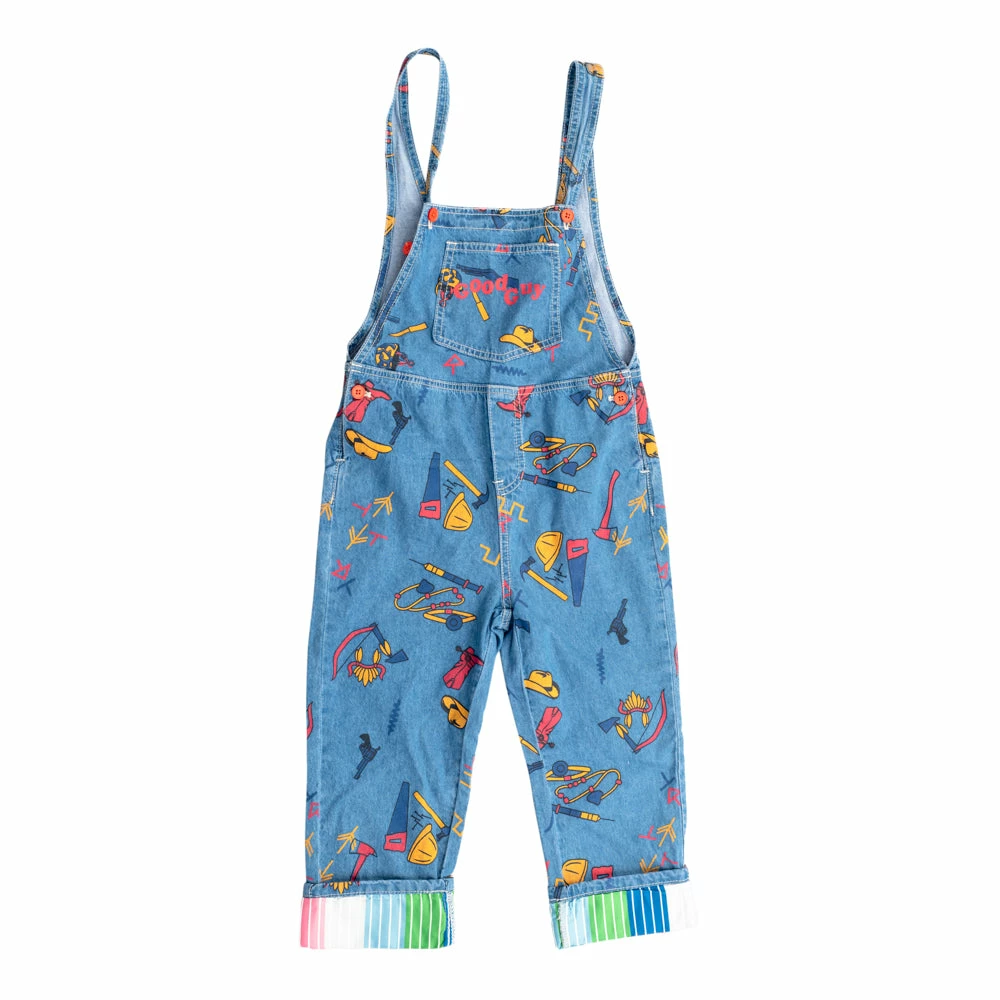 - Includes a long sleeve multicolor t-shirt, and a denim overall with a chest pocket, and two from pockets. Does not include anything else