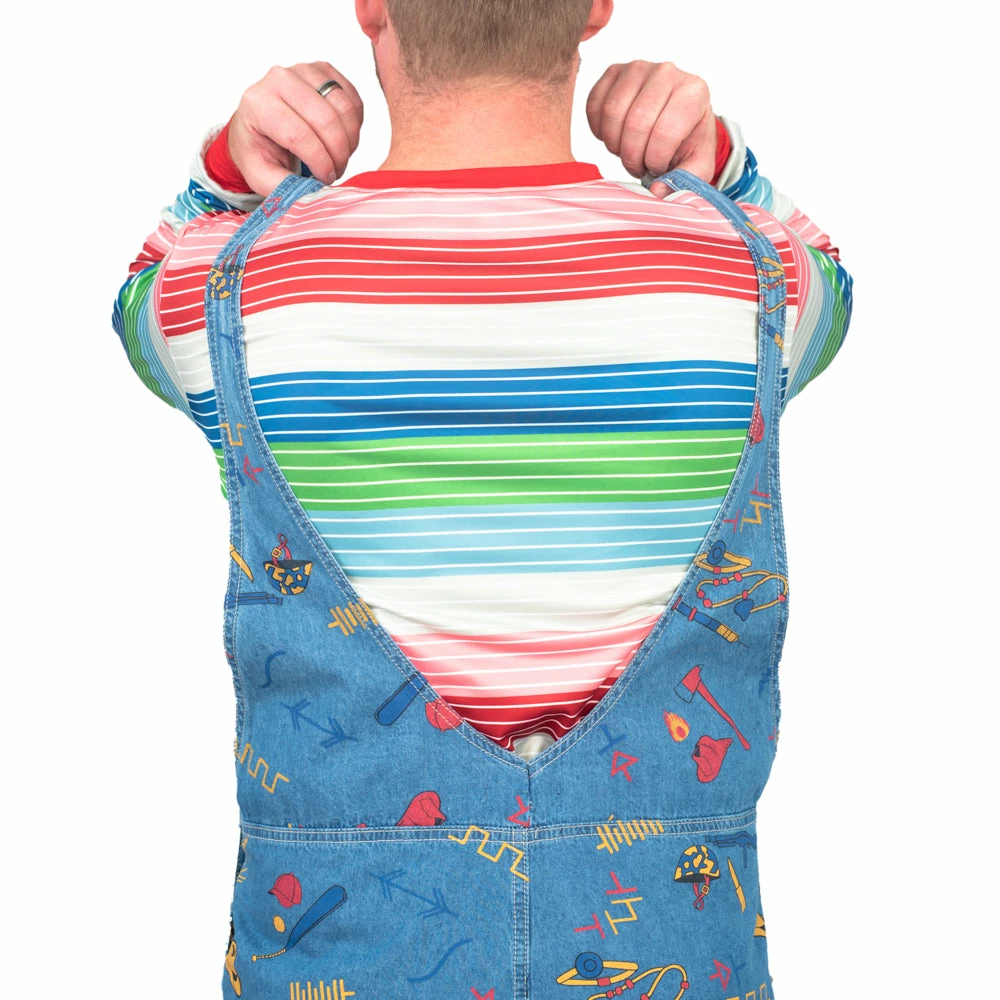 - Includes a long sleeve multicolor t-shirt, and a denim overall with a chest pocket, and two from pockets. Does not include anything else.