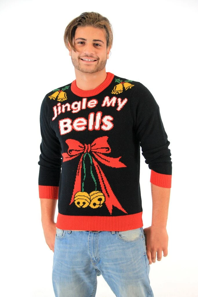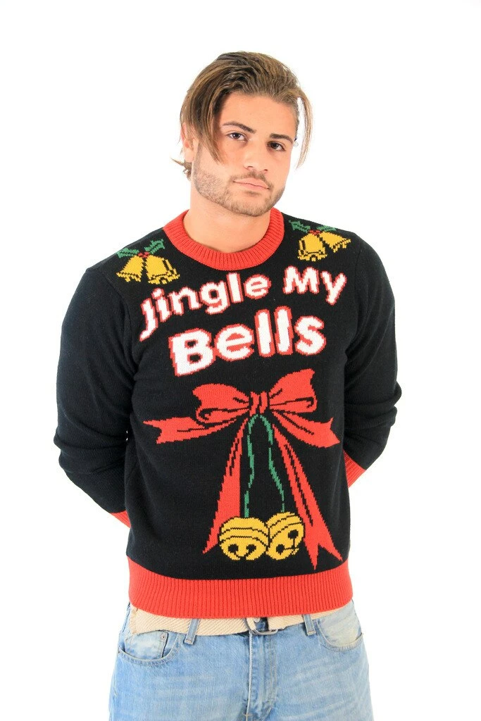 Are you looking for a rude and funny way to spread holiday cheer this winter? If so, perhaps you should keep warm with this hilarious Jingle My Bells sweater! The innuendo is strong with this one. With a black background and not much decoration to speak of, this ugly Christmas sweater is sure to be the talk of any holiday party – and it might even win a few contests! Celebrate Christmas by sharing a few laughs with friends thanks to this humorous holiday sweater.
