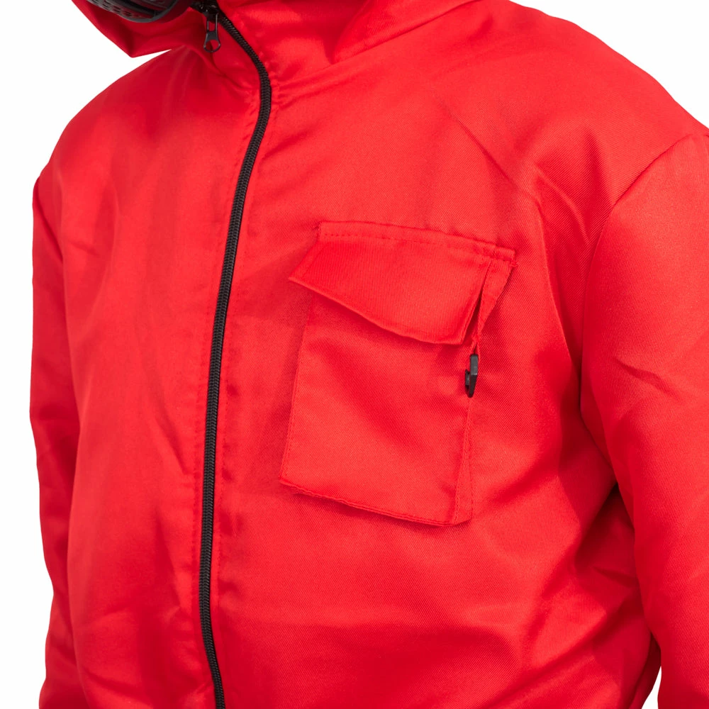 - Halloween Costume includes a red zip up jumpsuit, belt, gloves and a mask.