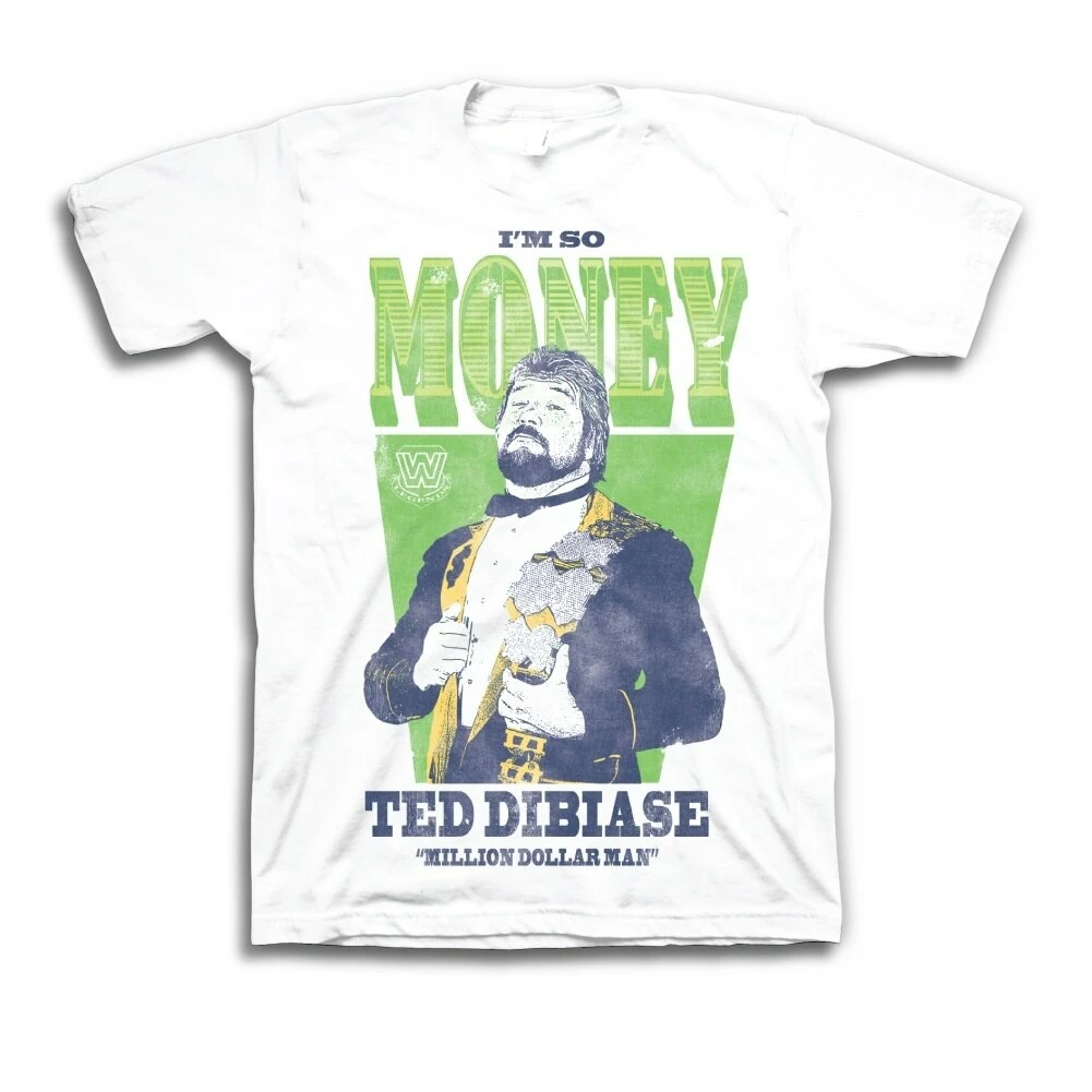 Do you remember the opulent tastes of professional wrestler Ted DiBiase? If so, why not show it off with style? This officially licensed WWE t-shirt features Ted with the tagline “I’m So Money,” making it an excellent choice for any long time fan of the WWE. Let the world know who your favorite wrestler is with this awesome Ted DiBiase t-shirt! Show some love for the Million Dollar Man with this retro WWF t-shirt.