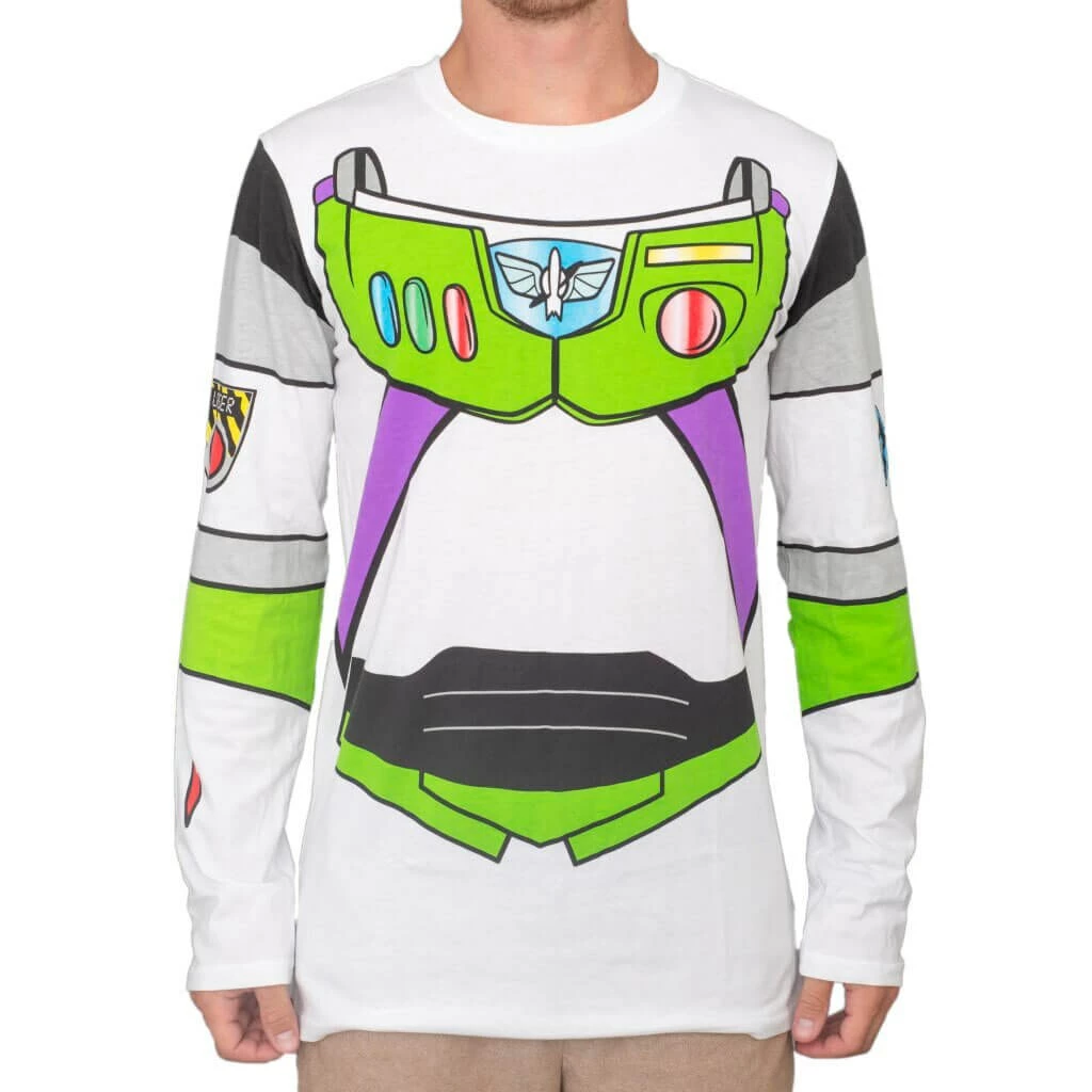 Order this officially licensed Buzz Lightyear costume tee, and you’ll be ready to travel to infinity and beyond! The white cotton t-shirt features a recreation of the “Toy Story” hero’s space suit. It’s perfect for Halloween, costume parties, or just kickin’ it in the toybox.