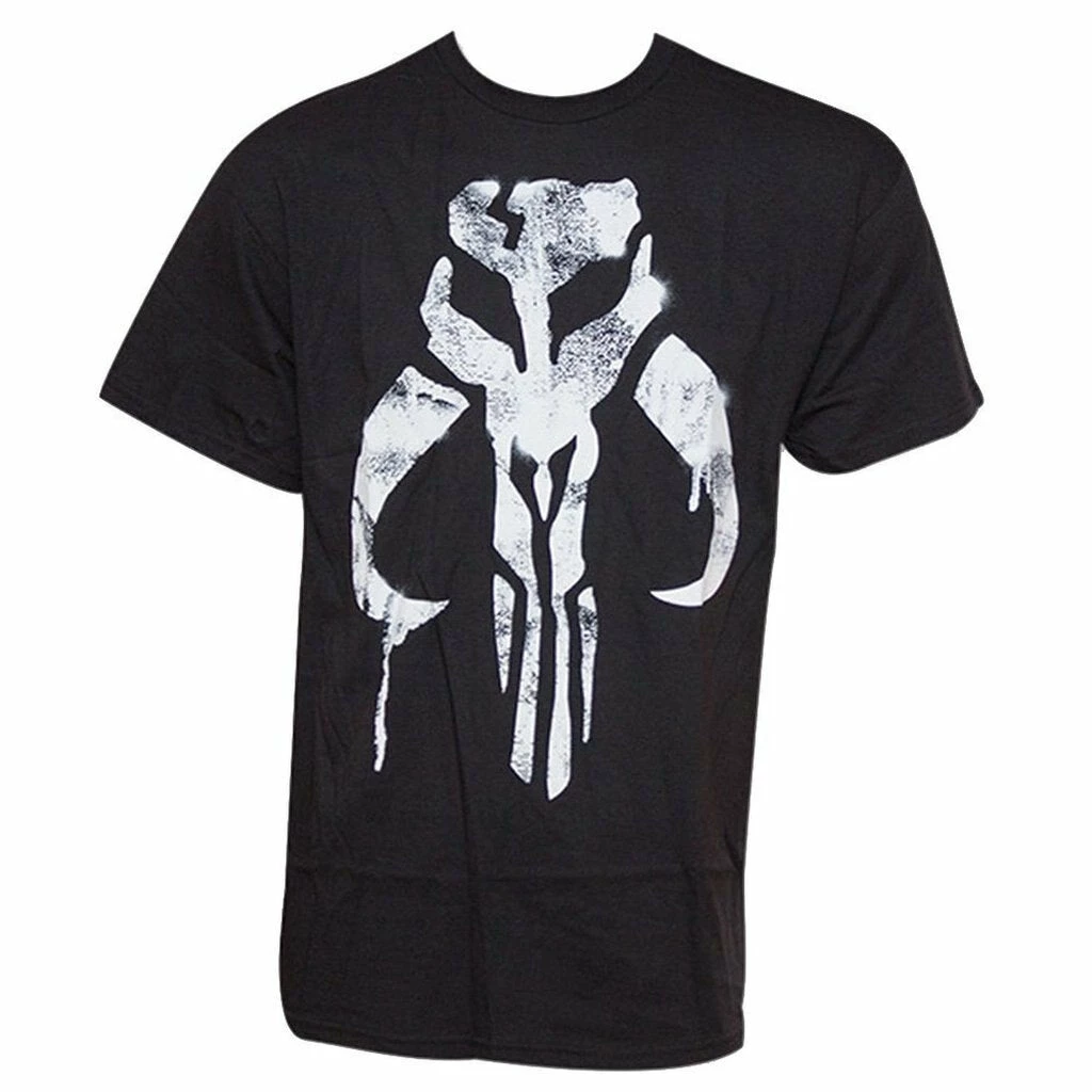 Are you canny enough to bear the mark of the deadliest bounty hunter in the galaxy? The fearsome logo of the infamous Boba Fett appears as a distressed graffiti print on the front of this black cotton tee. It’s sure to strike fear into smugglers from Bespin to Alderaan! (Carbonite shipping not available in the U.S.)