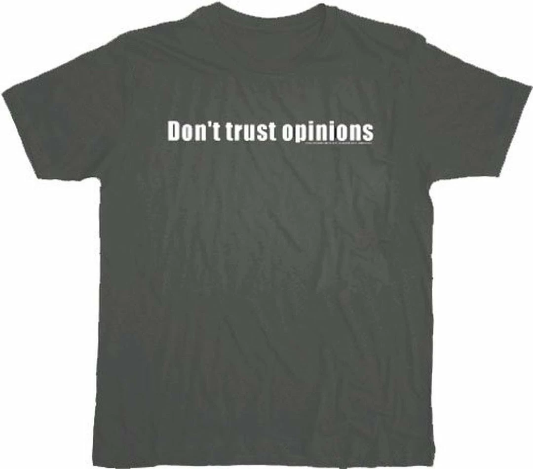 Take a critical-thinking lesson from TV’s least endearing doctor with this officially licensed “House” t-shirt! The charcoal cotton tee features a classic House-ism from the popular Fox TV series: “Don’t Trust Opinions.” The “House” logo appears on the back.