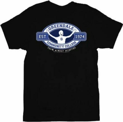 Fear not, outcasts: at Greendale Community College (est. 1974), “You’re already accepted!” This black cotton “Community” t-shirt features a print of the Greendale logo and human being mascot alongside the school’s motto. It’s the perfect attire for your dysfunctional study group.