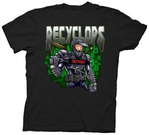 DESTROY! Dwight Schrute has taken over “The Office” in the from of the lethal Recyclops: part futuristic robot, part green crusader! Let everyone you meet know that recycling is not an option wearing this black cotton tee. Recyclops cannot be stopped!