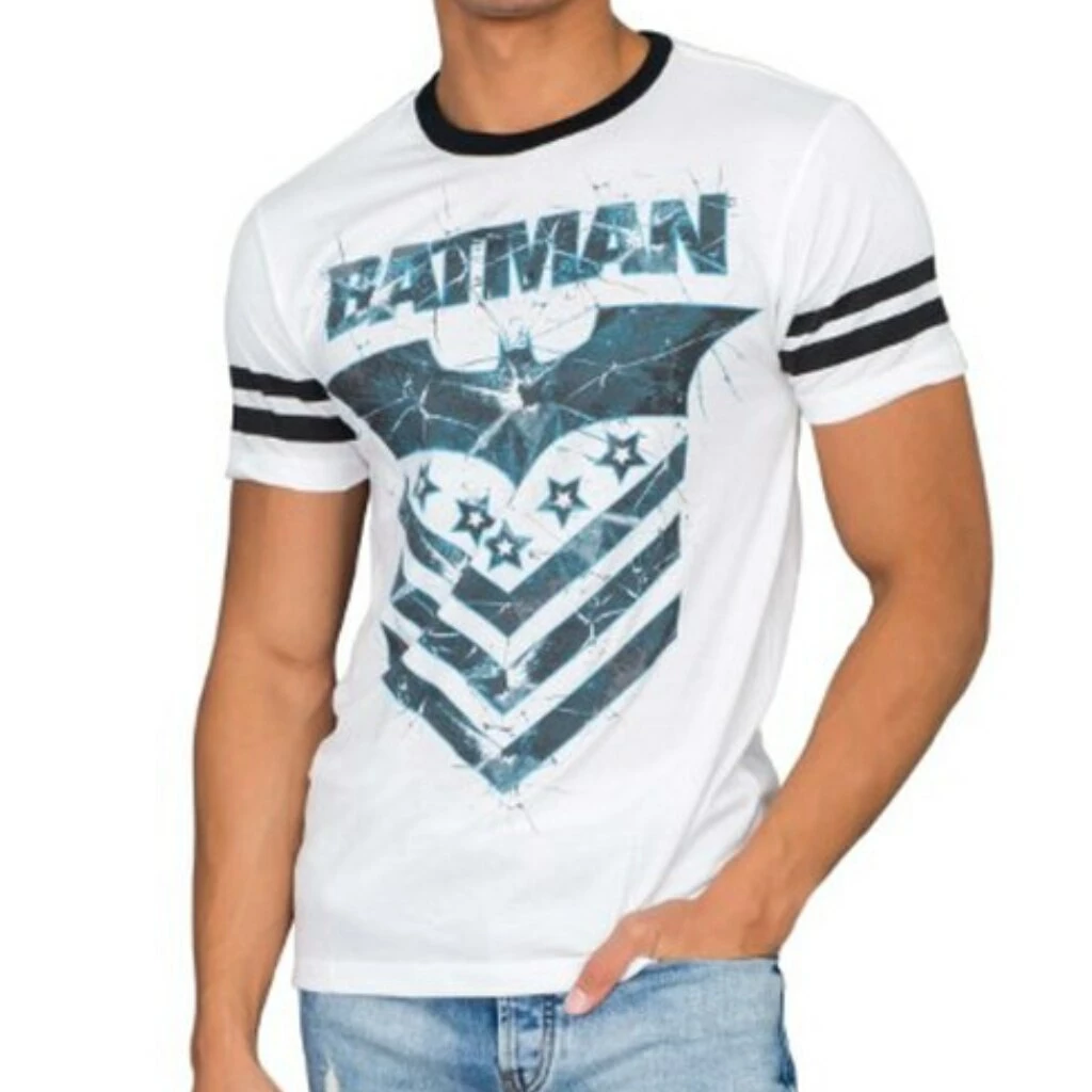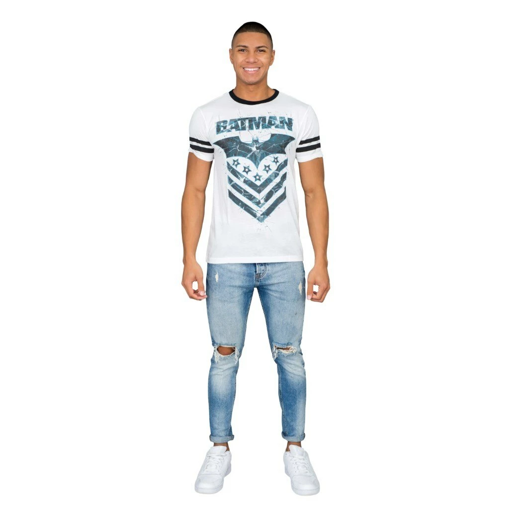 Are you a fan of Christopher Nolan’s Dark Knight franchise? Then show it off in style with this cool Batman t-shirt! With a distressed print for the perfect retro look and feel, this Dark Knight t-shirt features the new Bat symbol with military flair. If you’re a fan of this beloved crime fighter, let the world know with this awesome retro style t-shirt!