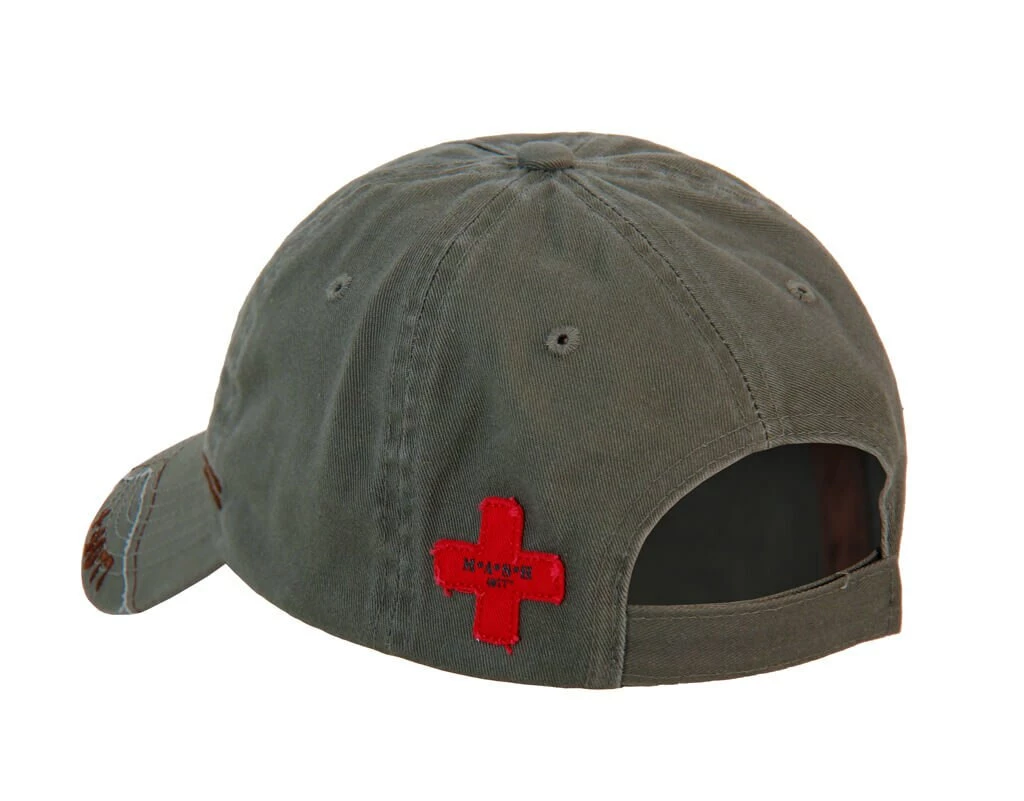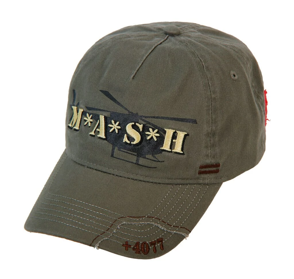 Don’t forget your cover! This adjustable “MASH” cap features a print of the series’ iconic chopper and yellow 4077th logo. The hat has been distressed and torn for vintage appeal.